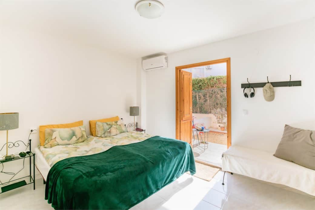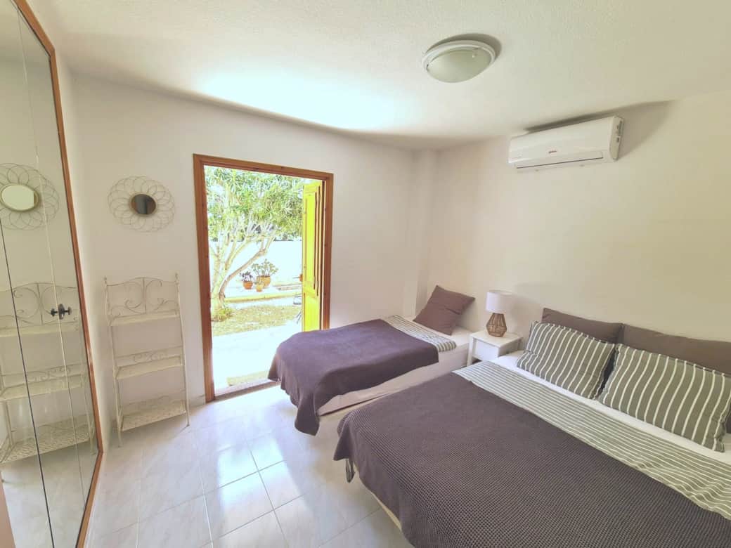 Spacious apartment with 2 bedrooms (for up to 5 people), kitchen, terrace and garden. The apartment is located in a quiet residential area with a large swimming pool surrounded by palm trees and a green garden.