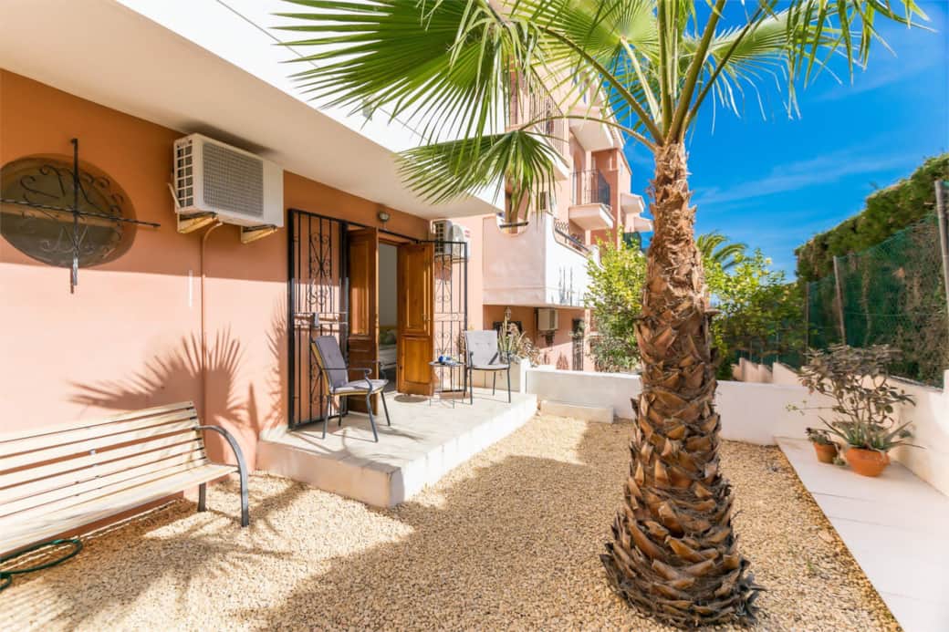 From both bedrooms you step out into the quiet back garden for relaxing on deckchairs in the shade of palm trees.